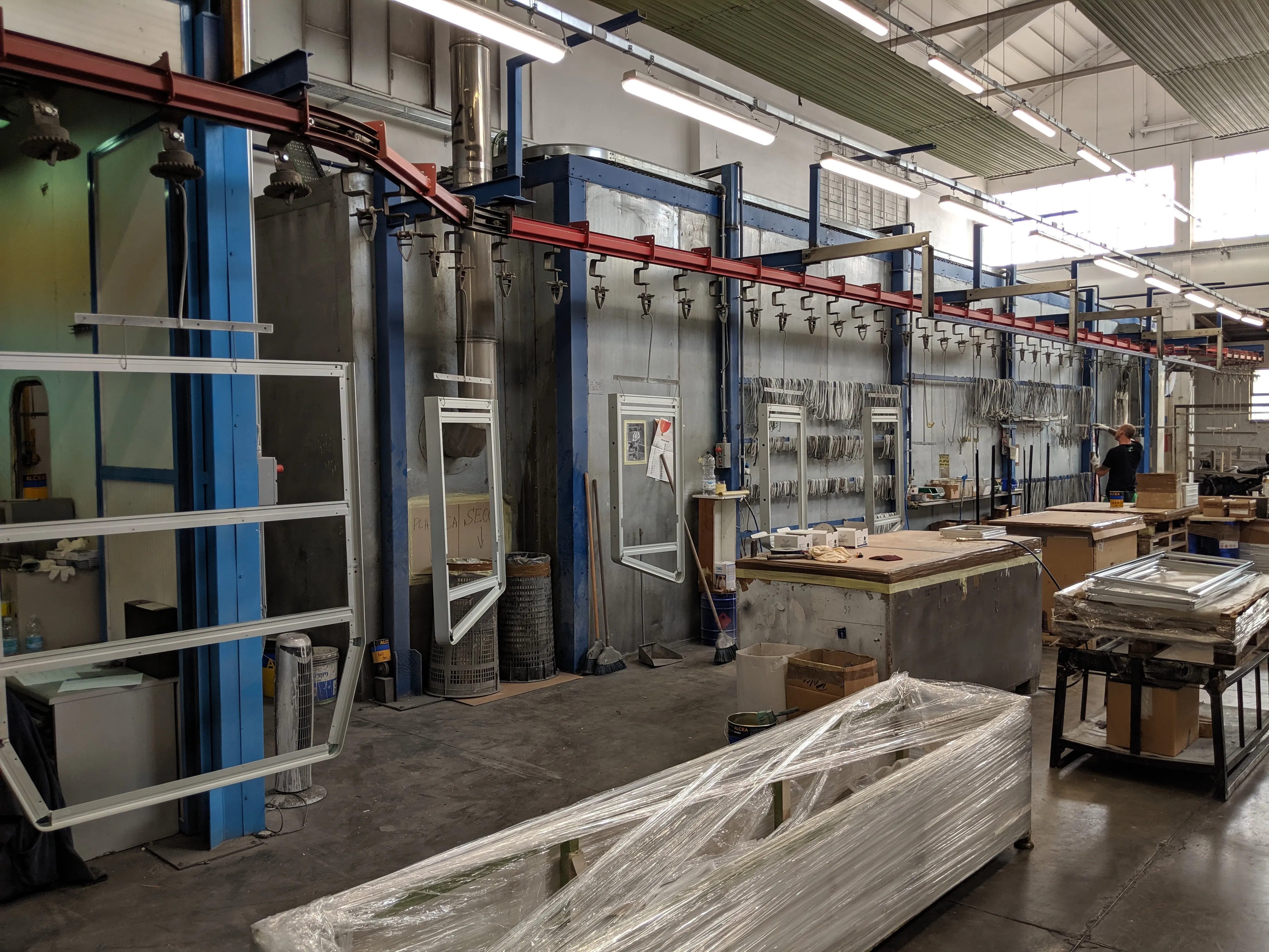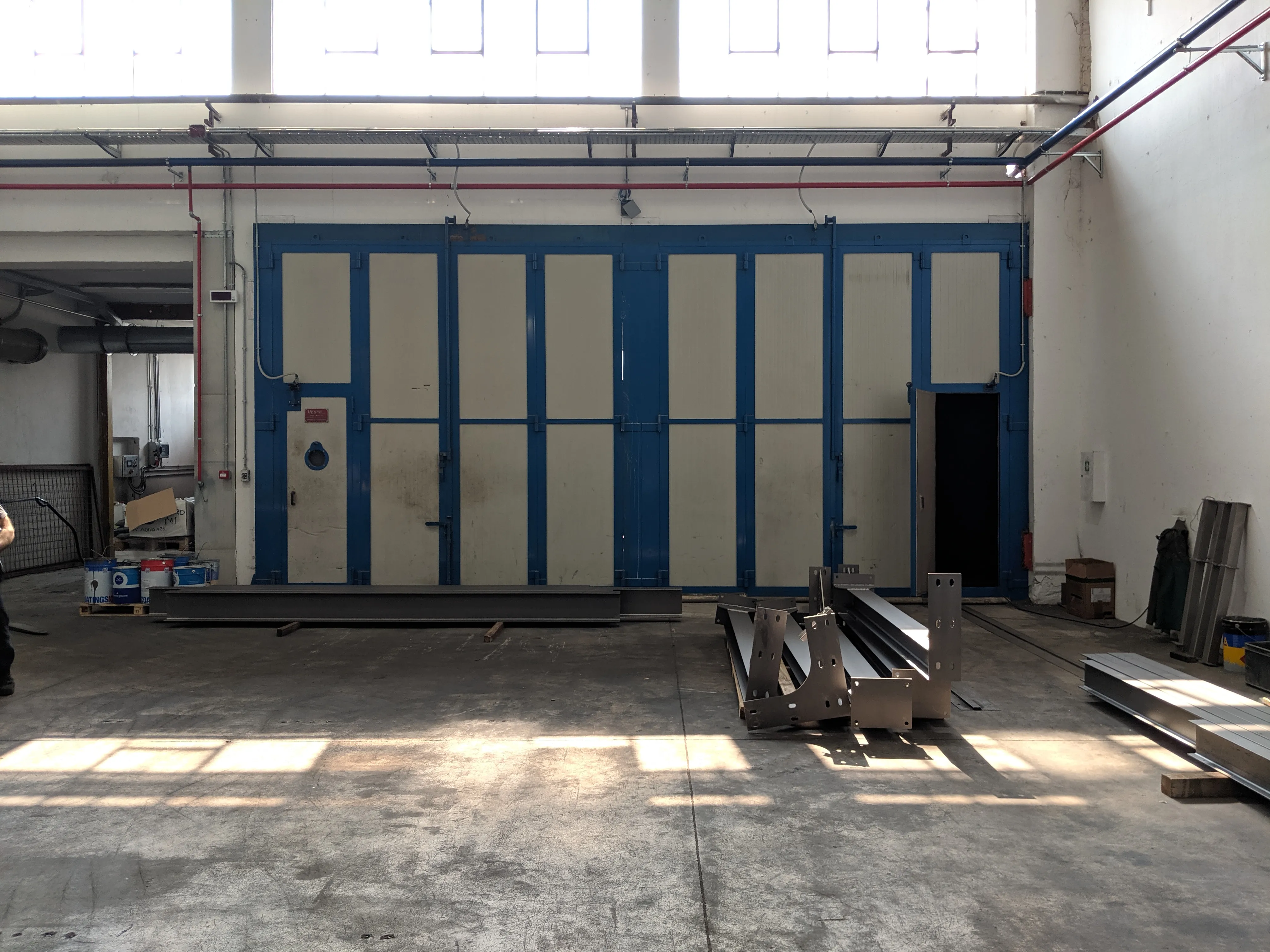 Due cabine: una per la sabbiatura e l’altra per la metallizzazione. Ingresso: 8000mm x 5000mm x 5000mm.